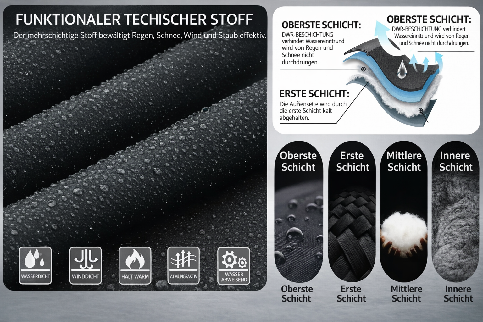 Die fortschrittliche hydrophobe Beschichtung weist starken Schneefall und Nässe ab und hält Sie bei längerem Aufenthalt im Freien trocken.
